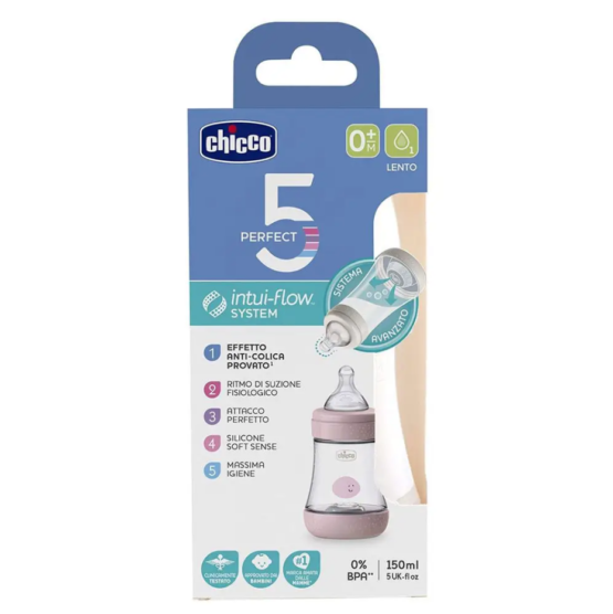 - Chicco PERFEKT 5 Ushqimi i ngadalshëm i shisheve 150 ml Kërkesat dietike, ritmi dhe intensiteti i thithjes janë unike për secilin fëmijë dhe ndryshojnë në çdo kohë të ditës. PERFEKT 5 është shishja Chicco që përshtatet natyrshëm me nevojat e fëmijës. Një revolucion në botën antikolike e cila, falë kombinimit të dhëmbit ekskluziv të Physio dhe Membrane inovative të ekuilibrit, mbështesin ritmin dhe intensitetin fiziologjik të fëmijës, duke ndihmuar në parandalimin e gëlltitjes së ajrit. Shishja biofunksionale Chicco PERFECT 5 lejon një ushqyerje të rregullt dhe të vazhdueshme të gjirit duke siguruar foshnjën një ndjenjë krejtësisht natyrale, falë mishit të butë silikoni me përfundimin Soft Sense dhe fleksibilitetit të valvulës së Membranit ekuilibër që me lëvizje mikro përshtatet me intensitetin e thithjes së fëmija.