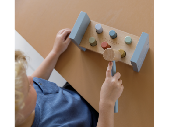 Trokit këtu, trokit atje! A mund t’i godasë fëmija juaj të gjitha kunjat? Duke përdorur një çekiç, duhet të ngulë 6 kunja me ngjyra në stendën prej druri. Kur të kenë mbaruar, thjesht kthejeni stendën dhe filloni përsëri! Mund të godisni me çekiç vazhdimisht!