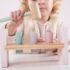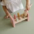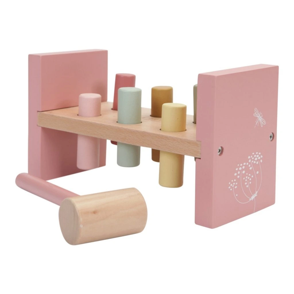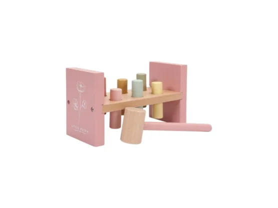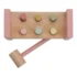 Trokitni kunjin dhe goditeni kunjin me çekiç! Përdorni çekiçin për të ngulur 6 kunja shumëngjyrëshe në stolin prej druri. Ky është një ushtrim i mirë për aftësitë motorike të fëmijës suaj. A janë ngulur të gjitha kunjat me çekiç? Kthejeni stolin dhe filloni përsëri! Mund ta ngulni me çekiç vazhdimisht!